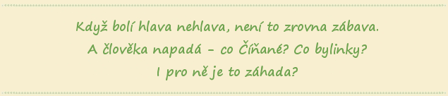 Toto základní praktické rozdělení slouží k lepší představě o tom, jak bolesti hlavy vidí čínská medicína a co všechno se při nich děje. Nejlepší však je, když se nic neděje – tedy když vás hlava nebolí, a pokud ano, ať vám dá čínská medicína naději, že závěje navátých bolestí z hlavy odstraníte.